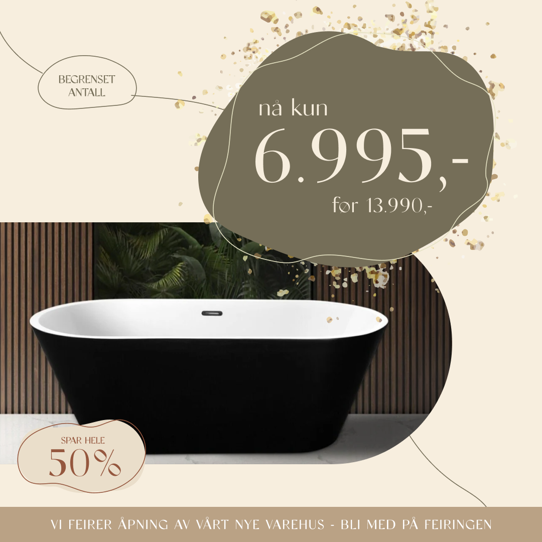 I forbindelse med vår åpningsfest, har vi nå badekar med opptil -50% rabatt. En rekke flotte kar, helstøpte i akryl, i blank eller matt overflate.