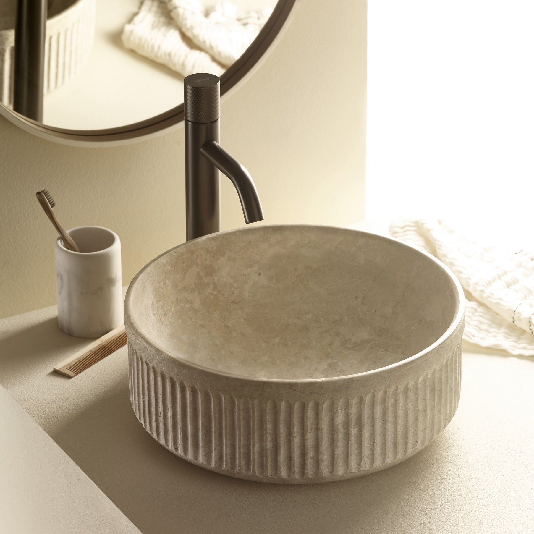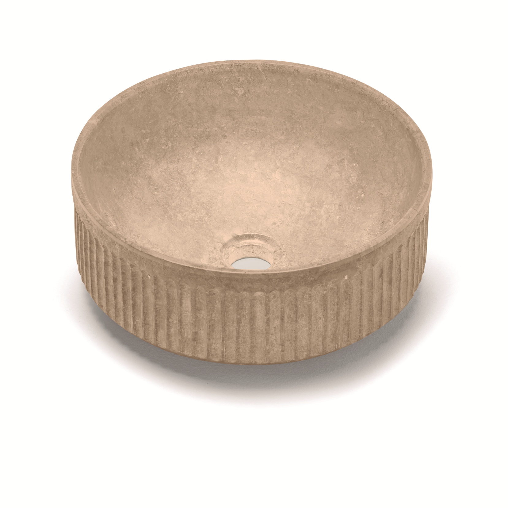 Toppmontert servant i marmor for montering på benkeplate. Fine detaljer med rillemønster på utsiden av servanten.