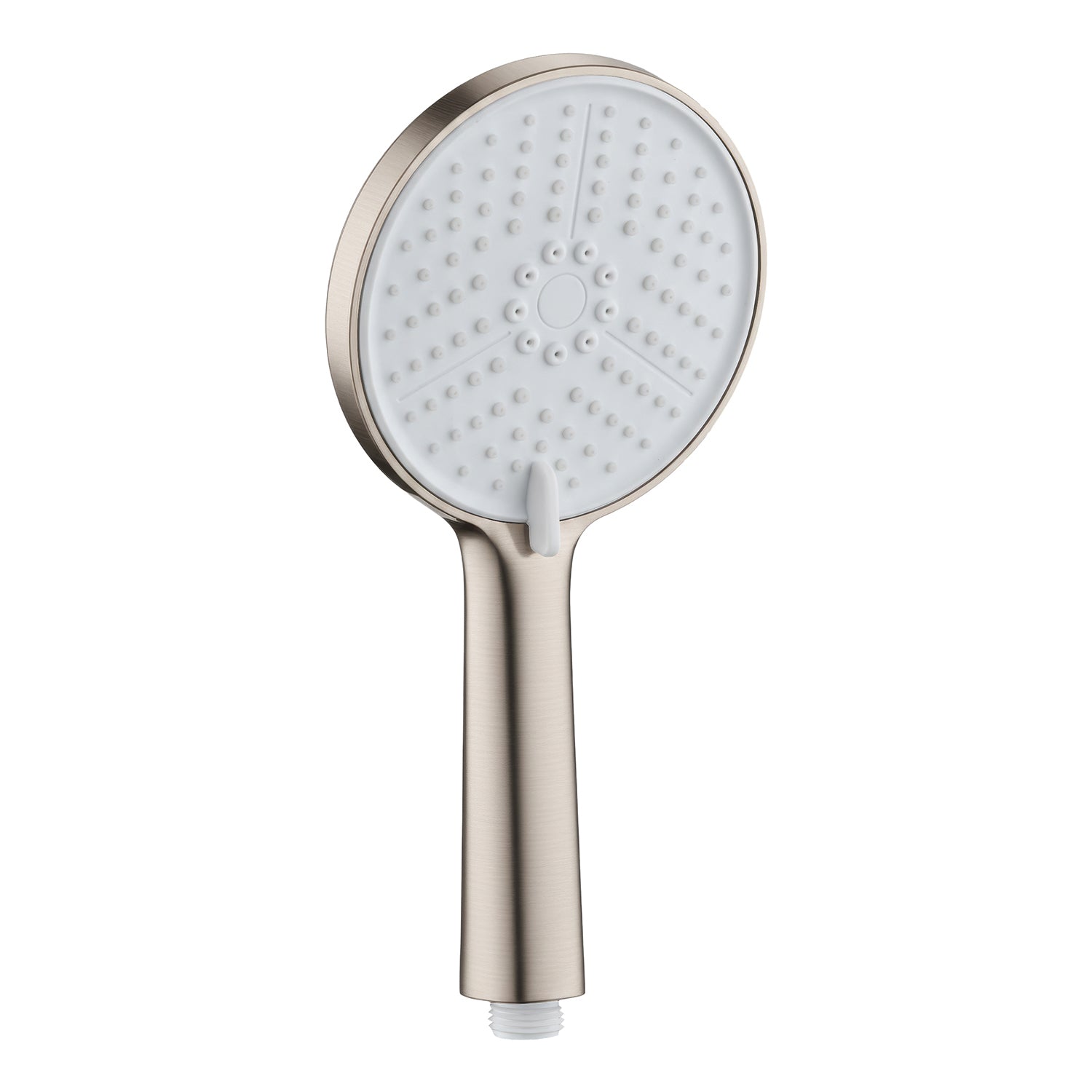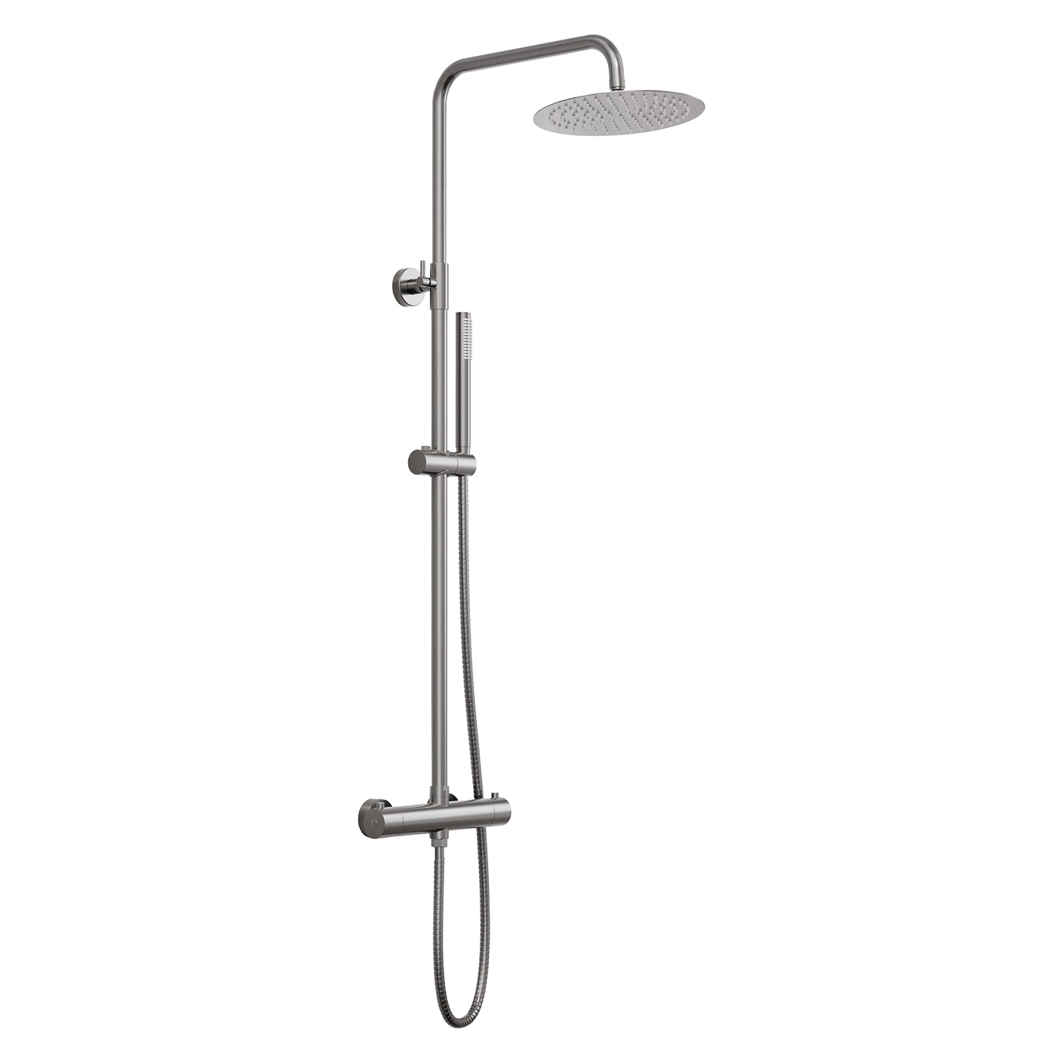 Komplett takdusj med termostatarmatur, justerbar høyde og valgbar hånddusj. Pakken inneholder to hånddusjer – en med flere strålealternativer og en minimalistisk modell – slik at du har fleksibilitet og reserve. Se bilde to for ekstra hånddusj som medfølger. Inkludert rosetter.