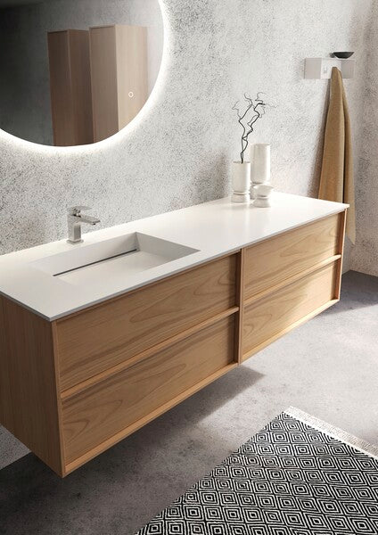 Tidløs og klassisk baderomsmøbel med ramme i heltre og eikefineer. Minimalistisk nordisk design med rene former og sofistikerte detaljer. Integrerte håndtak i eik bidrar til å skape et helhetlig og elegant møbel for en nordisk, naturlig og moderne stil.