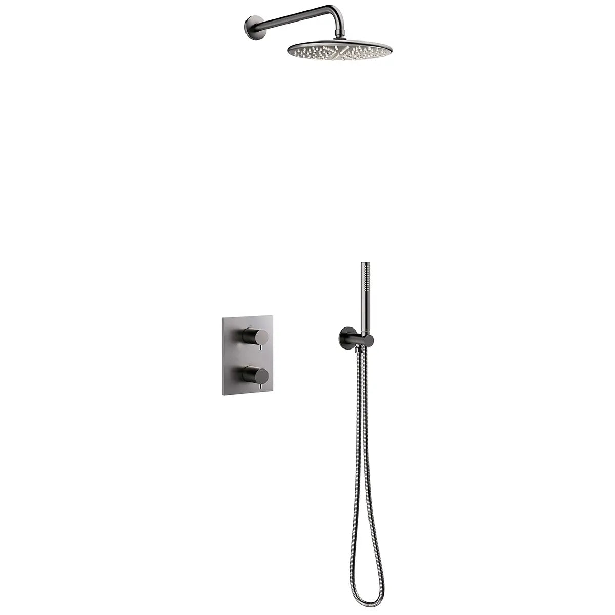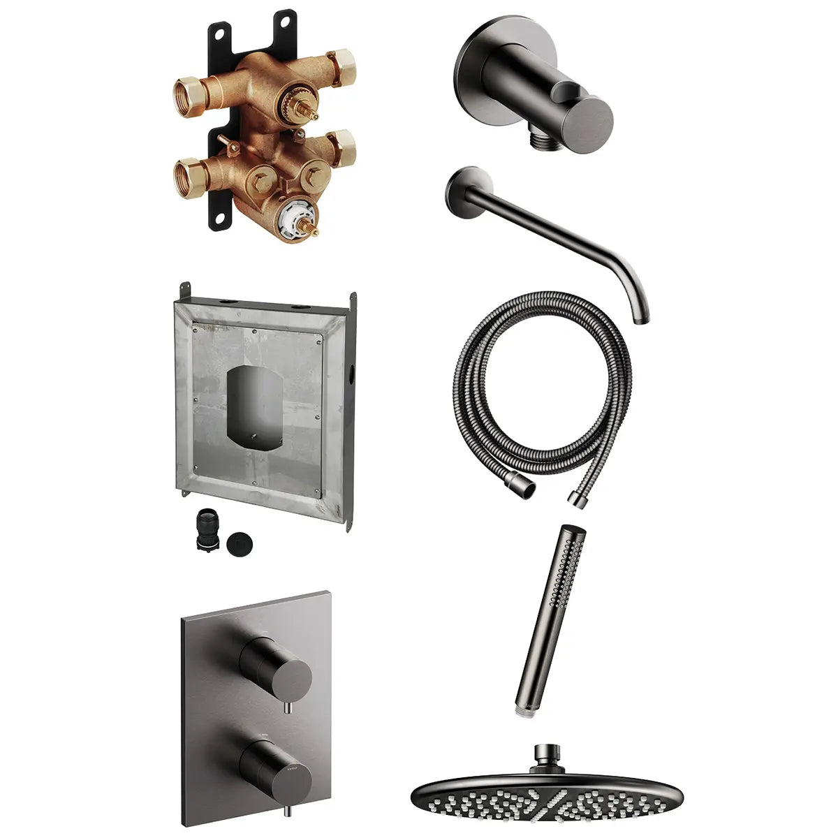 Komplett pakke inkludert dusjrør 400mm, dusjhode Ø250mm, håndusj, 1500mm metallslange med antitwist og veggbrakkett. Med lekkasjesikret boks og innvendig rørtilkobling.