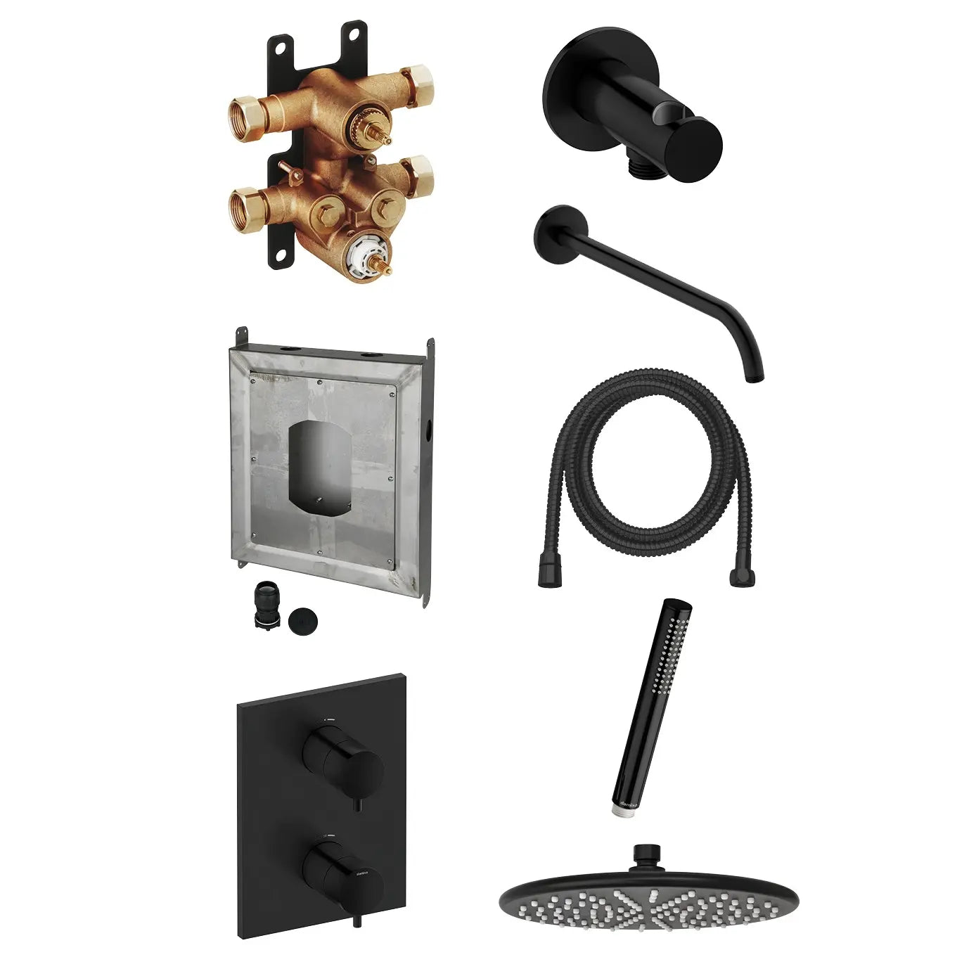 Komplett pakke inkludert dusjrør 400mm, dusjhode Ø250mm, håndusj, 1500mm metallslange med antitwist og veggbrakkett. Med lekkasjesikret boks og innvendig rørtilkobling.