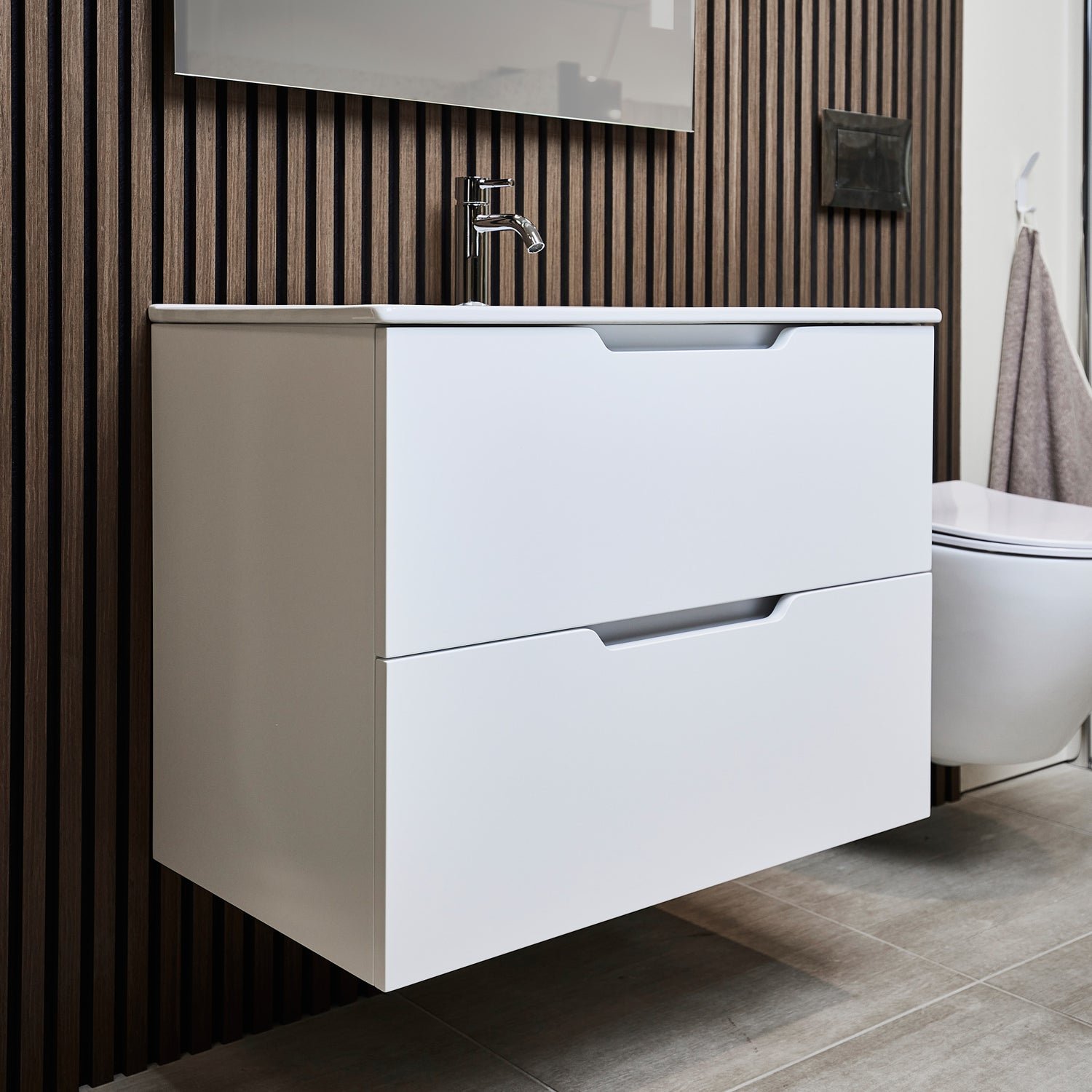 Hva inngår i pris: Baderomsmøbel med dobbel servant. (Blandebatteri og popup kjøpes separat)
