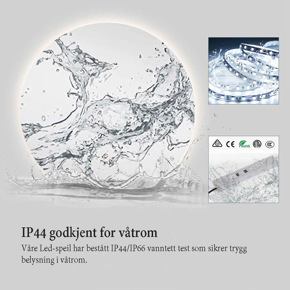 Et av våre bestselgende produkter! Flott LED-speil med varmt og behagelig lys, enkelt oppheng og nydelig design. Strømuttak midt på bak speil. Speilet er rett i bunn slik at det kan plasseres som på bildet på topp av enhver rett flate. Speilet har antidugg-teknologi som gjør at selv ved en ekstra lang dusj holder det seg fri for dugg.