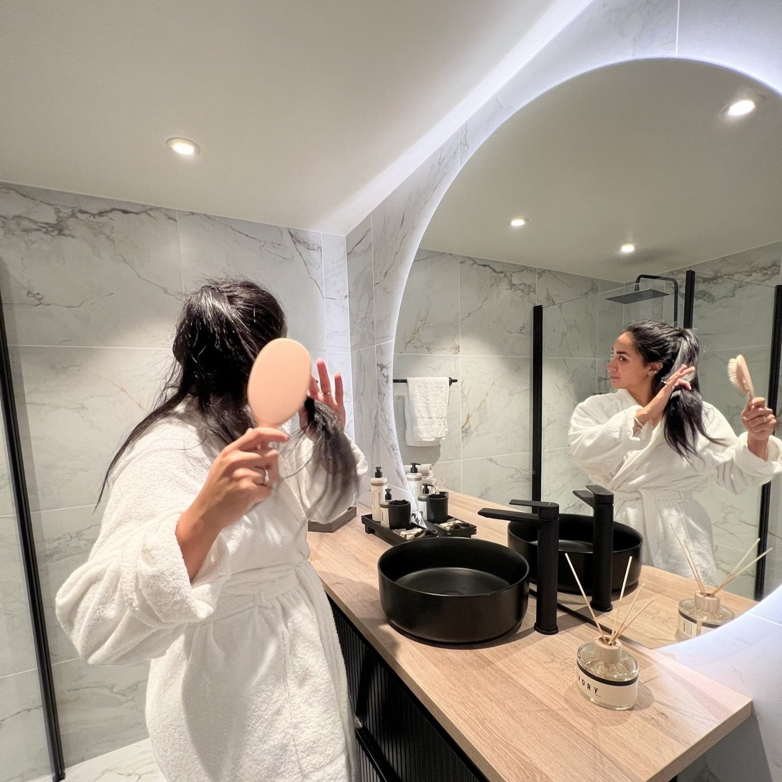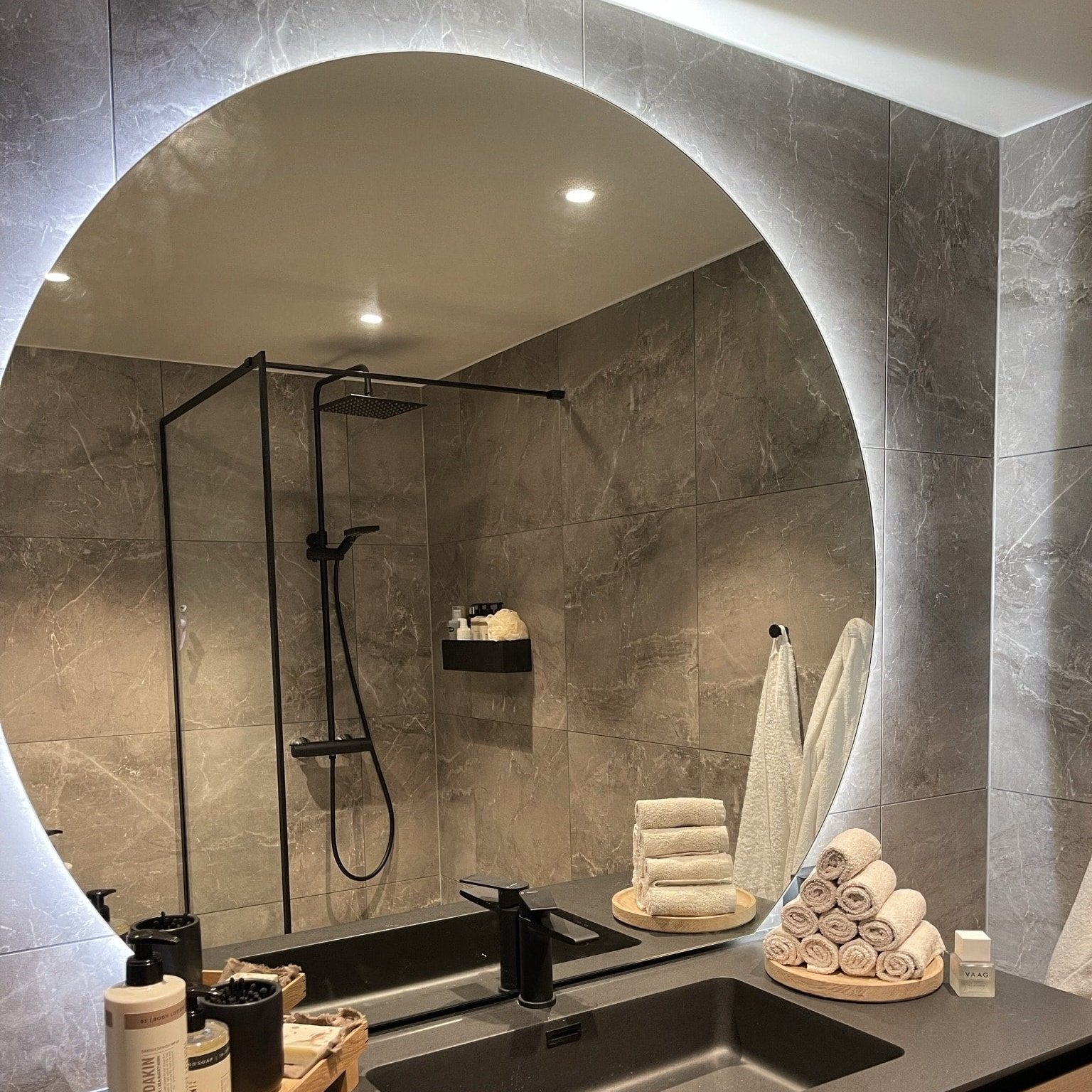 Et av våre bestselgende produkter! Flott LED-speil med varmt og behagelig lys, enkelt oppheng og nydelig design. Strømuttak midt på bak speil. Speilet er rett i bunn slik at det kan plasseres som på bildet på topp av enhver rett flate. Speilet har antidugg-teknologi som gjør at selv ved en ekstra lang dusj holder det seg fri for dugg.
