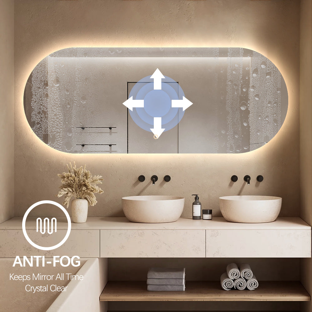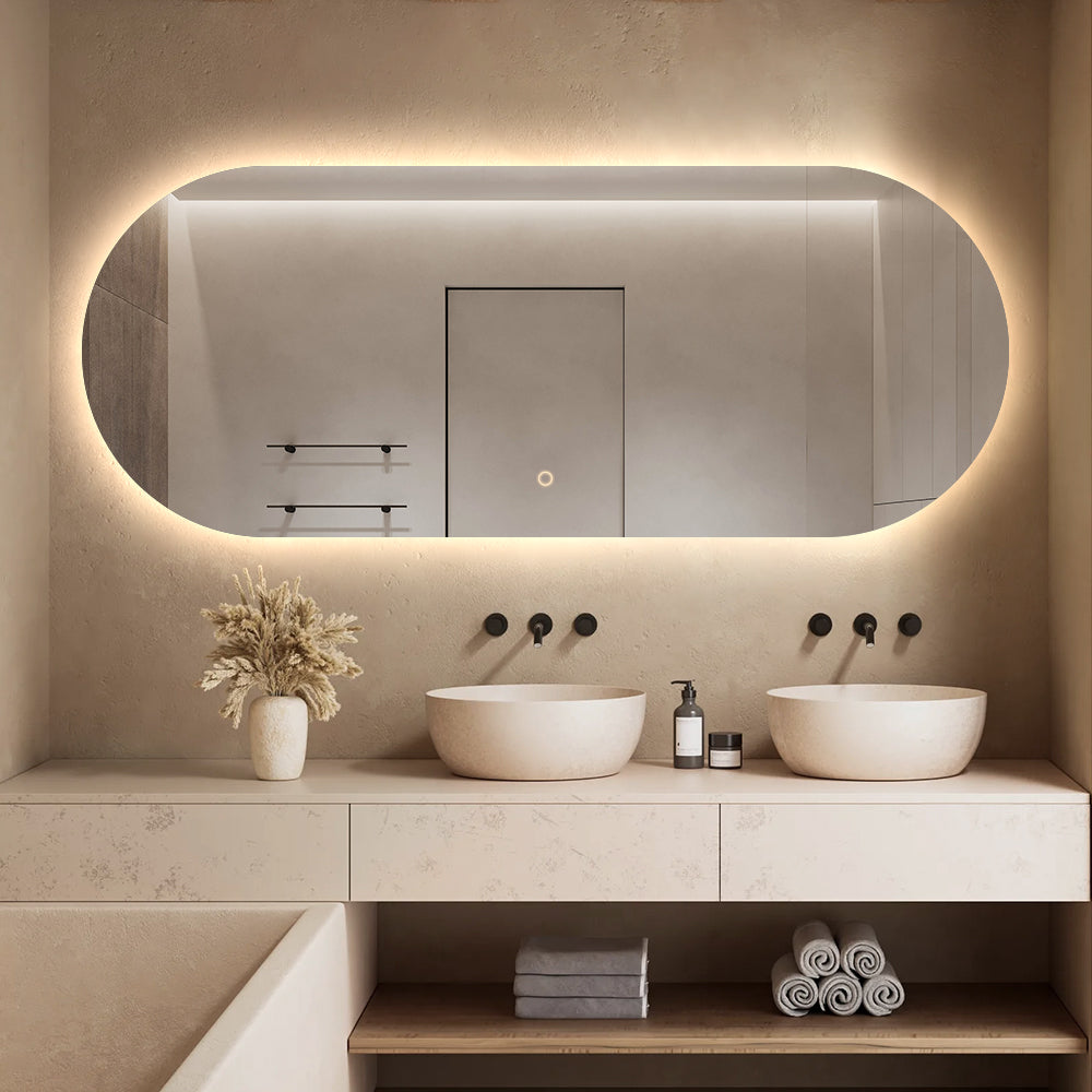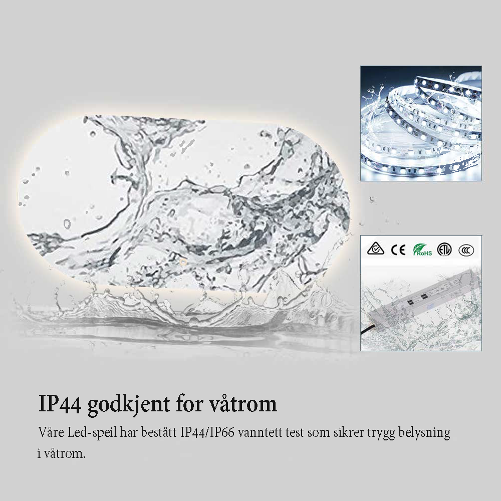 Flott moderne speil med toutch-bryter som du enkelt kan dimme lysstyrken opp og ned med. Det nette, stilrene uttrykket kombinert med varmt og behagelig lys vil badet ditt få et stort løft. Speilet er har antidugg og sørger for at det holder seg fritt for dugg ved en ekstra lang dusj, og er selvfølgelig IP44 godkjent for montering på bad. Kobles direkte på veggpunkt.